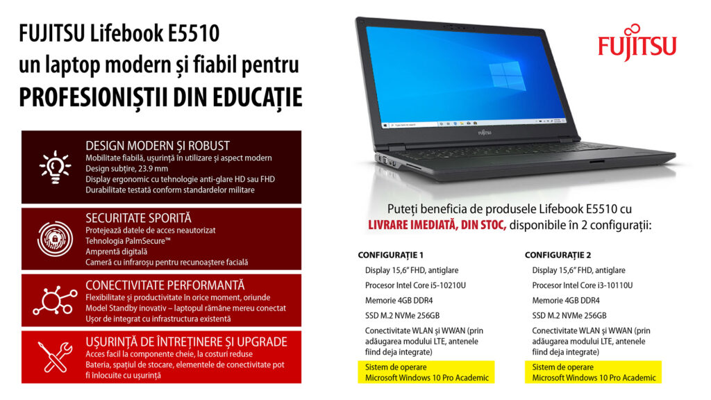 FUJITSU vine în întâmpinarea nevoilor profesioniștilor din domeniul educațional cu o serie de dispozitive cu livrare imediată, din stoc: laptopul LIFEBOOK E5510, complet echipat pentru solicitările profesorilor atât din mediul universitar, cât și cel preuniversitar.