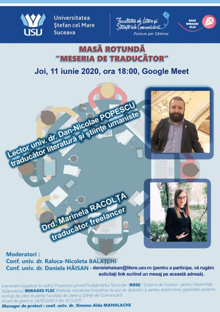 Pe 11 iunie a avut loc, în format on-line, cea de a treia ediţie a mesei rotunde intitulate „Meseria de Traducător”, organizată pentru studenții din anul I ai Universității “Ștefan cel Mare” din Suceava, în cadrul proiectului ROSE MIRAGES FLSC, coordonat de conf. univ. dr. Simona-Aida Manolache.