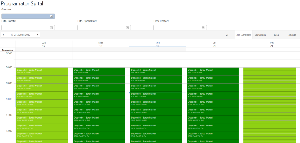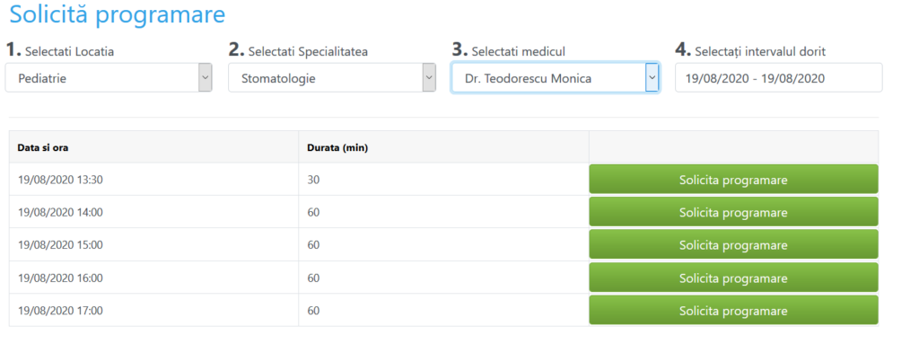 Fluxul programărilor trebuie să fie unul foarte simplu: în primă fază pacientul intră pe site-ul clinicii, își selectează ziua, ora și medicul la care dorește programare și trimite solicitarea, fiind atenționat în cazul în care este nevoie de un bilet de trimitere. Medicul va primi cererea pe mail și sms, iar după aceptare, pacientul va primi la rândul lui un sms și un mail cu confirmarea programării precum și ora și numele doctorului.